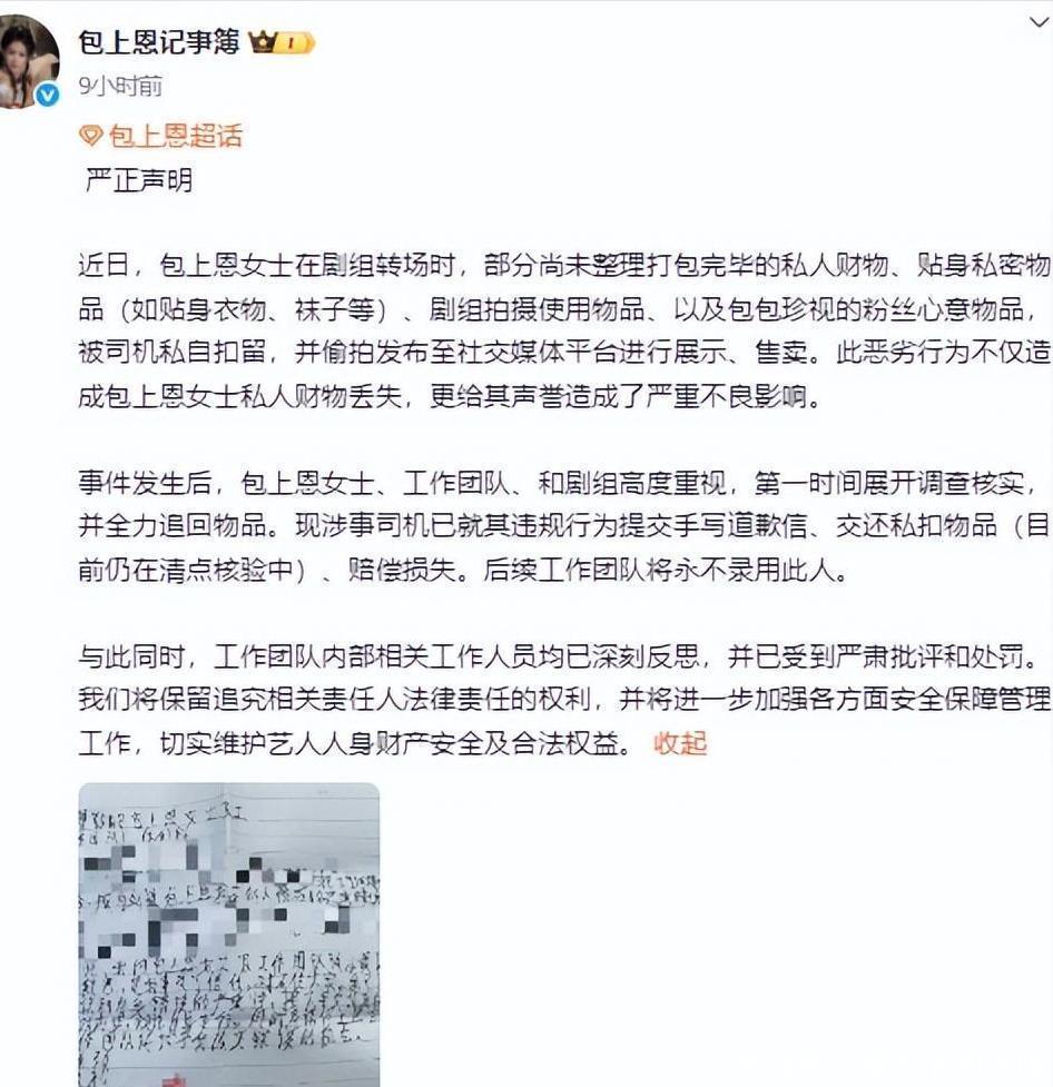 明星团队又出事,粉丝礼物去哪了演员包上恩最近也遇到了麻烦事,10月31日,她的工作室发布声明,说她的司机私藏了粉丝送的礼物和她的私人物品,还拍照发到了网上,被私留的东西包括口罩、挂件、没穿过的袜子等,虽然不值什么钱,但这事关乎职业道德。