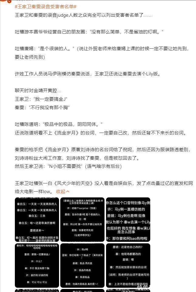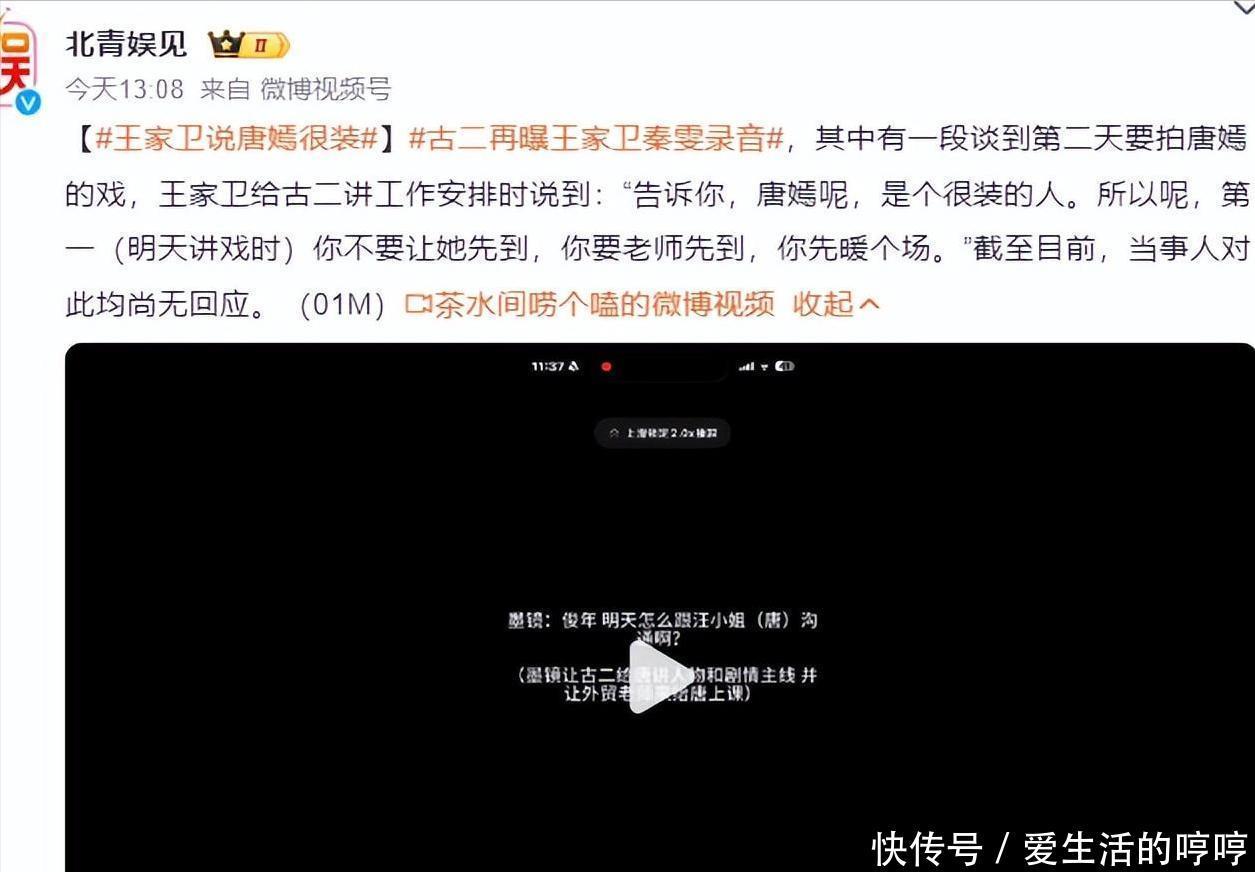 这些录音内容相当劲爆,王家卫在录音中点评了不少演员,说唐嫣"很装",还提到《流金岁月》拍摄时刘诗诗和倪妮抢台词的事。