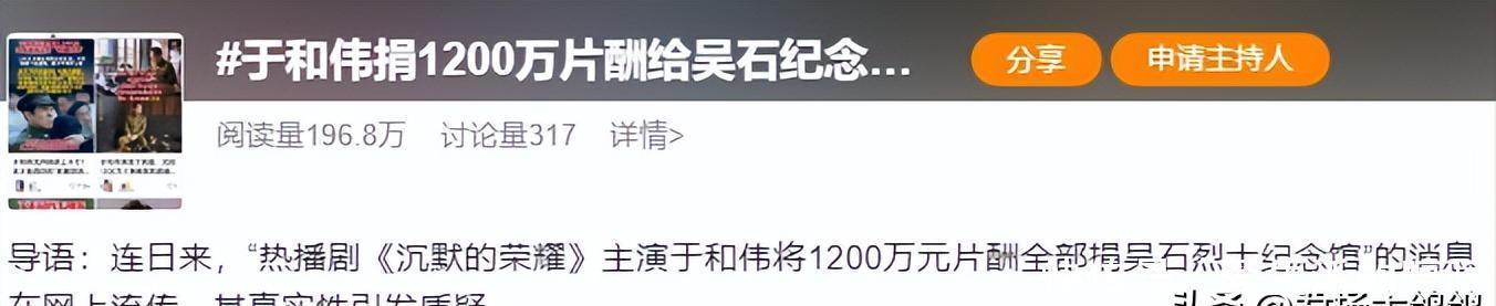 于和伟陷捐款风波,好演员遭遇"捧杀"于和伟这几年可以说是炙手可热,特别是在《沉默的荣耀》中的出色表现,不仅获得了观众认可,还得到了人民日报等官方媒体的点赞,但人红是非多,最近他就陷入了一场捐款风波。