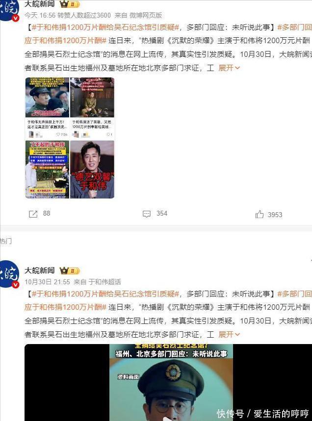 事情是这样的:10月下旬开始,网络上流传一种说法,称于和伟把《沉默的荣耀》的1200万片酬全部捐给了吴石烈士纪念馆,而且特别强调他低调行善,没有大肆宣传。